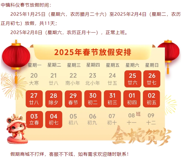 2025 新春快樂 蛇歲呈祥瑞,新春納萬福!值此春節(jié)來臨之際,中鏡科儀集團(tuán)全體員工向長期以來關(guān)注和支持我們的各級領(lǐng)導(dǎo)、廣大客戶及合作伙伴,致以誠摯的問候和衷心的感謝!
