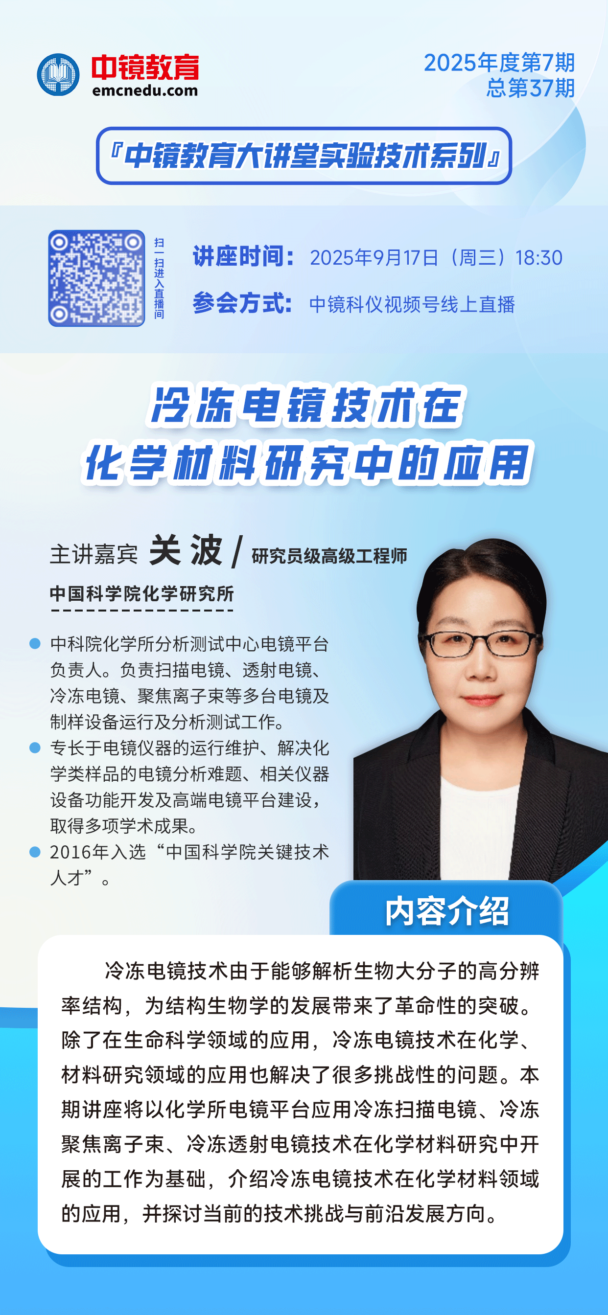講座回放 中鏡教育大講堂-實(shí)驗(yàn)技術(shù)系列 2025年第7期(總第37期) 冷凍電鏡技術(shù)在 化學(xué)材料研究中的應(yīng)用 為推動(dòng)實(shí)驗(yàn)技術(shù)的蓬勃發(fā)展,打造行業(yè)學(xué)習(xí)交流的平臺(tái),由中鏡教育發(fā)起的2025年“中鏡教育大講堂”第七期-“實(shí)驗(yàn)技術(shù)系列”講座圓滿結(jié)束。 冷凍電鏡技術(shù)不僅為結(jié)構(gòu)生物學(xué)發(fā)展帶來革命性突破,近年來在化學(xué)、材料研究領(lǐng)域也發(fā)揮重要作用,成功解決了電子束敏感材料高分辨結(jié)構(gòu)表征、液相中組裝結(jié)構(gòu)微觀表征等諸多挑戰(zhàn)性問題。本期特邀中國(guó)科學(xué)院化學(xué)研究所分析測(cè)試中心電鏡平臺(tái)負(fù)責(zé)人、項(xiàng)目研究員級(jí)高級(jí)工程師關(guān)波老師,帶來《冷凍電鏡技術(shù)在化學(xué)材料研究中的應(yīng)用》專題講座。關(guān)波老師結(jié)合中國(guó)科學(xué)院化學(xué)研究所分析測(cè)試中心電鏡平臺(tái)實(shí)際工作,詳細(xì)介紹了冷凍掃描電鏡、冷凍聚焦離子束、冷凍透射電鏡技術(shù)在化學(xué)材料研究中的具體應(yīng)用,深入剖析技術(shù)要點(diǎn),并針對(duì)當(dāng)前冷凍電鏡技術(shù)面臨的挑戰(zhàn)與前沿發(fā)展方向展開探討。講座內(nèi)容緊密結(jié)合實(shí)踐、邏輯清晰,既有技術(shù)深度又有應(yīng)用廣度,精彩非凡! 現(xiàn)將本期講座回放發(fā)布,供大家學(xué)習(xí),歡迎大家觀看!