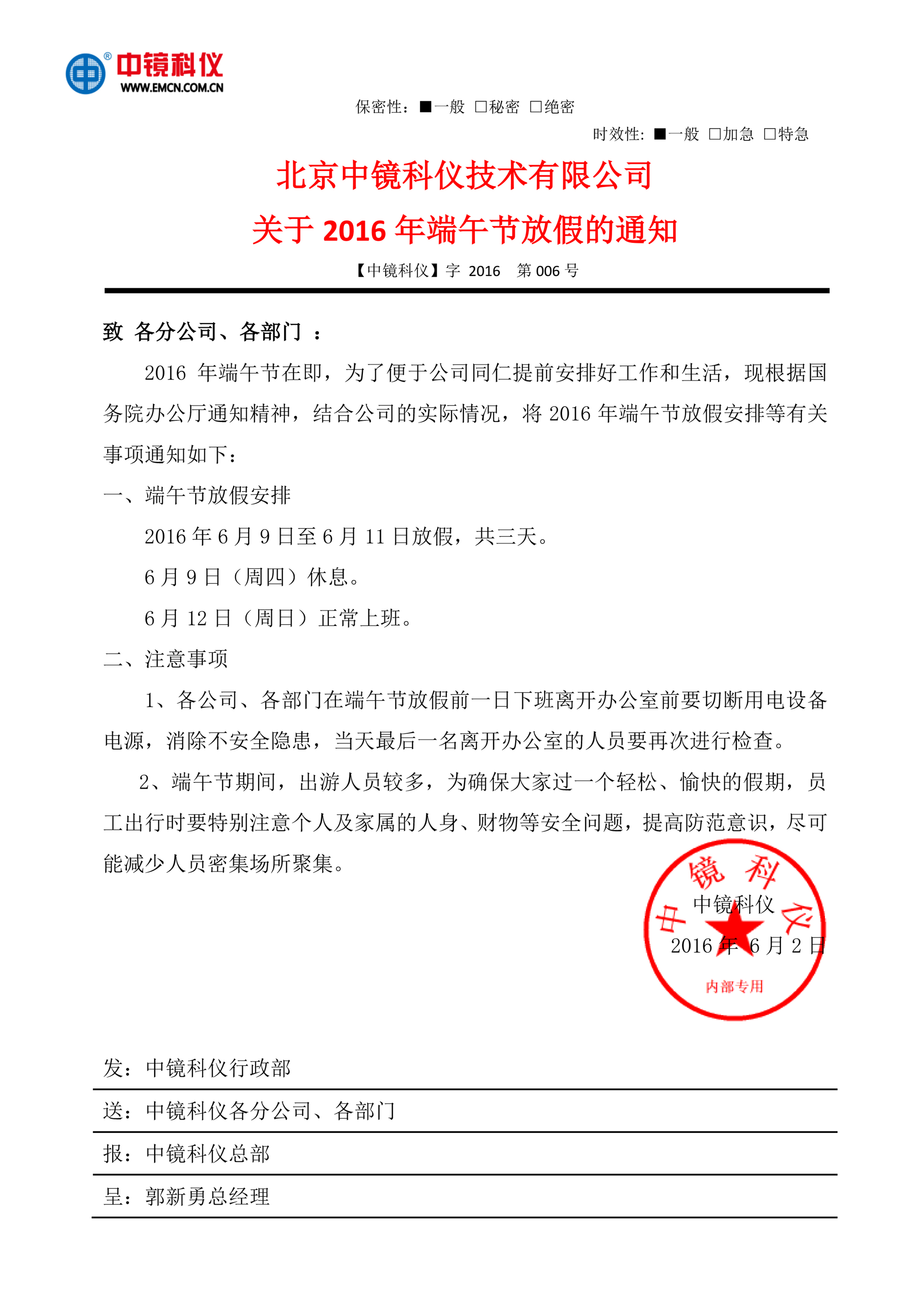北京中鏡科儀技術(shù)有限公司關(guān)于2016年端午節(jié)放假的通知