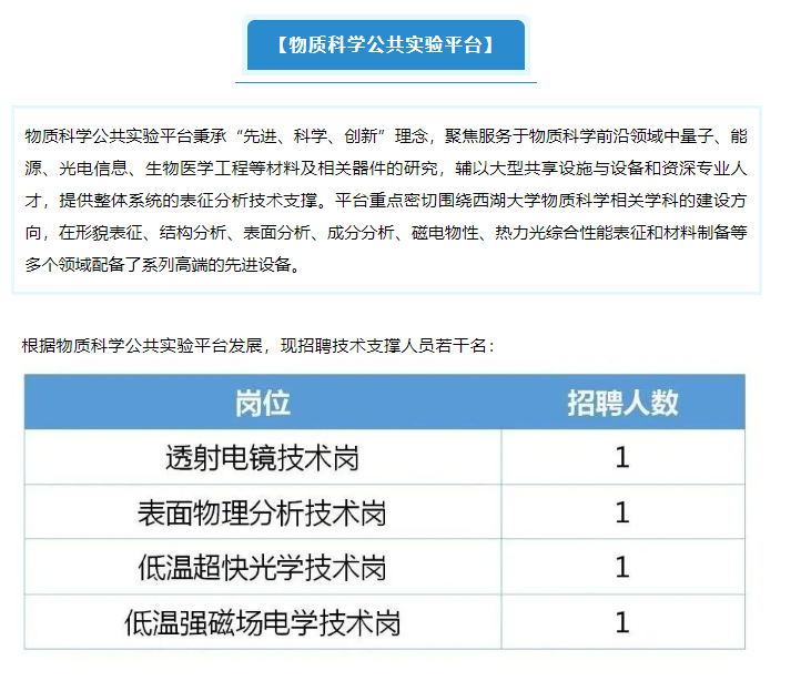 西湖大學是一所社會力量舉辦、國家重點支持的新型研究型大學,主要開展基礎(chǔ)前沿科學技術(shù)研究,堅持發(fā)展有限學科,注重學科交叉融合,從博士研究生培養(yǎng)起步,著重培養(yǎng)具有社會責任感的拔尖創(chuàng)新人才。 學校設(shè)置實驗室與科研設(shè)施部,通過建立健全學校大型科研設(shè)施、儀器設(shè)備服務支撐保障體系,實現(xiàn)學校大型儀器開放共享,保障學校教學、科研等各項事業(yè)的發(fā)展。實驗室與科研設(shè)施部下設(shè)六個校級公共科研服務平臺,各平臺作為支持服務學??蒲邪l(fā)展的重要利器,不斷追逐技術(shù)前沿、研發(fā)創(chuàng)新技術(shù)方法,致力于打造各自領(lǐng)域內(nèi)國際領(lǐng)先的技術(shù)平臺。 經(jīng)過近幾年的快速發(fā)展,各平臺已經(jīng)配置了國際先進的儀器設(shè)備,集合了一批海內(nèi)外優(yōu)秀的技術(shù)人才,為進一步強化隊伍建設(shè),提高平臺科研服務能力,現(xiàn)面向海內(nèi)外優(yōu)秀技術(shù)人才發(fā)出邀請,誠邀有志之士加盟。