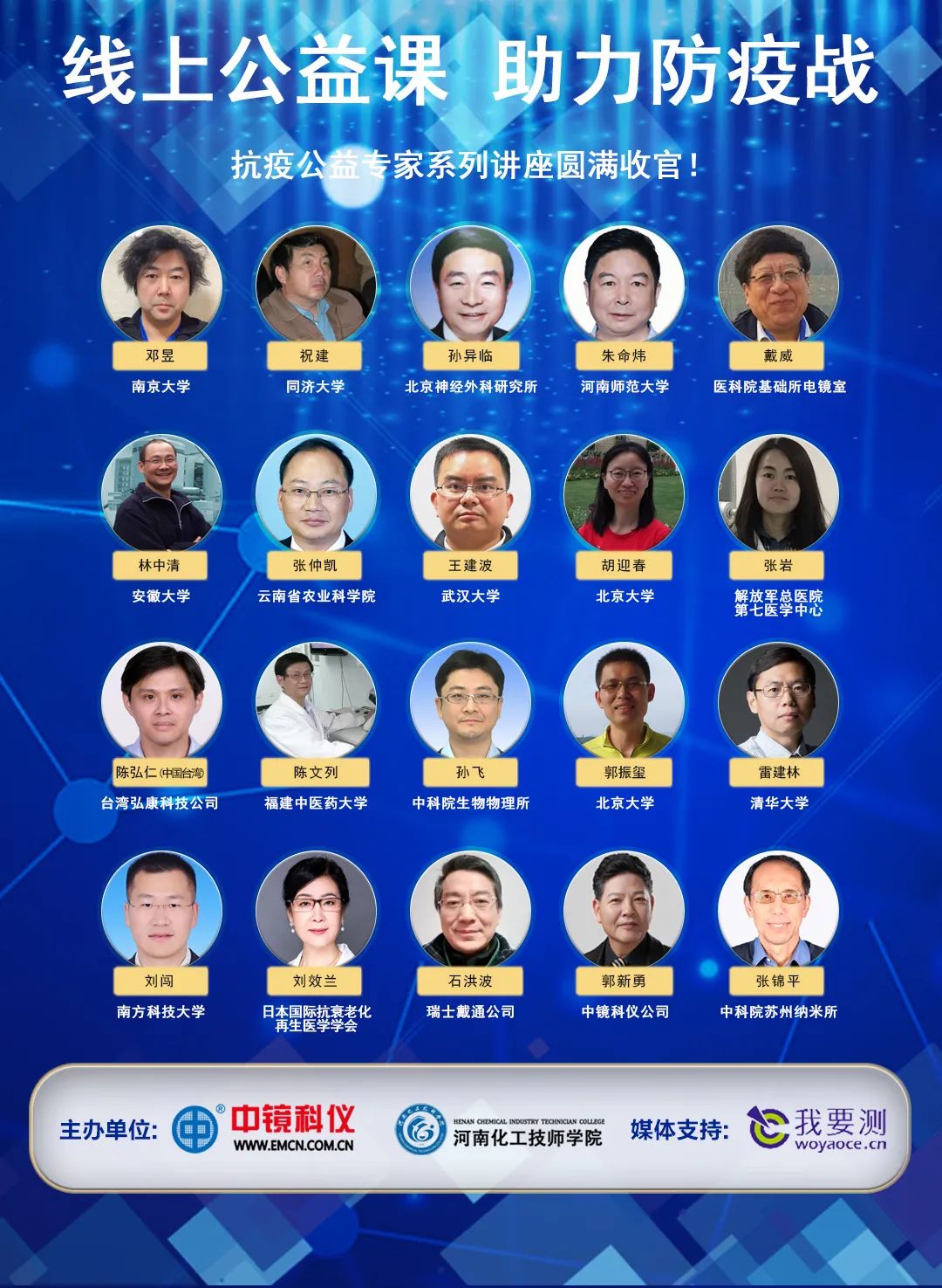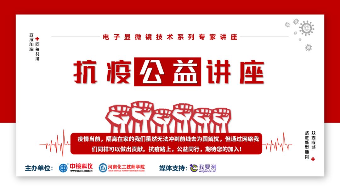 疫情當(dāng)前,我們“停工不停學(xué)”。由中鏡科儀、河南化工技師學(xué)院、我要測(cè)網(wǎng)共同發(fā)起的“線上公益課 助力防疫戰(zhàn):抗疫公益講座”活動(dòng)圓滿結(jié)束,共計(jì)四期,20節(jié)課程,內(nèi)容“硬核”,初心依舊! 2020年的春天,疫情突然爆發(fā),給我們帶來了始料未及的沖擊。隔離在家的我們雖然無法沖到前線去為國解憂,但通過網(wǎng)絡(luò)我們同樣可以做出屬于我們的貢獻(xiàn)。 疫情發(fā)生后,中鏡科儀本著“堅(jiān)持黨的領(lǐng)導(dǎo)、“堅(jiān)持校企合作”、“堅(jiān)持育人理念”、“堅(jiān)持服務(wù)行業(yè)”、“堅(jiān)持面向世界的理念”,聯(lián)合河南化工技師學(xué)院和我要測(cè)網(wǎng),積極響應(yīng)教育部及人社部的號(hào)召,組織開展此次“線上公益課 助力防疫戰(zhàn):抗疫公益講座”活動(dòng)。 在為期一個(gè)月的時(shí)間里,來自世界各地的二十位電鏡專家,為我們帶來了一場場精彩的視聽盛宴。 各位專家在接到此次公益講座倡議書后,積極響應(yīng)并投入大量精力備課,將所學(xué)、所知、所想、所悟,傾囊相授,做到了“傳承技藝、堅(jiān)守本心”。為新一代電鏡人樹立了榜樣,引起了強(qiáng)烈的社會(huì)反響,受到了一致好評(píng)。 此次講座直播頁面總瀏覽量超2萬人次,直播間參與人次15542人次,講座回放總瀏覽量超16000次,直播總時(shí)長2337分鐘,會(huì)后問答505個(gè),獲得良好的社會(huì)反響。尤其是在這個(gè)疫情特殊時(shí)期,雖然我們并未走上“前線”,但我們也在為國家、為行業(yè)做著自己的貢獻(xiàn)。 在這個(gè)特殊時(shí)期,各位專家勇于擔(dān)當(dāng),甘于奉獻(xiàn),沖在了抗疫工作的第一線。他們就是我們行業(yè)的楷模!還有各位積極參與聽講的老師和同學(xué)們,響應(yīng)國家號(hào)召“停工停課不停學(xué)”,隔離期間依然堅(jiān)持學(xué)習(xí)。 我們所有的工作都會(huì)在這一特殊歷史時(shí)期下,成為助力科學(xué)事業(yè),推動(dòng)行業(yè)發(fā)展,促進(jìn)身心健康的源動(dòng)力,這些故事都將載入中國電鏡史的史冊(cè)。 致辭 河南化院副校長管錚高度贊揚(yáng)了二十位電鏡屆頂尖專家學(xué)者的無私奉獻(xiàn)精神和社會(huì)責(zé)任感。 聽線上公益課,助防疫攻堅(jiān)戰(zhàn)。 懷揣公益初心,全程重磅干貨。 專家愛心講授,傳承電鏡精神。 此次抗疫公益講座活動(dòng)圓滿結(jié)束! 致謝:最后感謝20位電鏡專家?guī)淼木手v座,感謝中鏡科儀各位臺(tái)前幕后的主持工作者,感謝河南化工技師學(xué)院領(lǐng)導(dǎo)和參與策劃的工作人員以及我要測(cè)網(wǎng)直播平臺(tái)的影視編輯和媒體宣傳。 講課專家(按報(bào)告順序排序):鄧昱、祝建、孫異臨、朱命煒、戴威、林中清、張仲凱、王建波、胡迎春、張巖、陳弘仁、陳文列、孫飛、郭振璽、雷建林、劉闖、劉效蘭、石洪波、郭新勇、張錦平; 策劃:郭新勇、楊箴立、安艷威; 總務(wù):管崢、董保杰、魏葆婷、王萍、郭運(yùn)波; 主持:程書潔、馬明、程亞光、趙勝藍(lán); 海報(bào):趙勝藍(lán)、王哲、李江偉; 微信:程璐琰; 后臺(tái):俞利平; 視頻剪輯:薛亞鵬。
