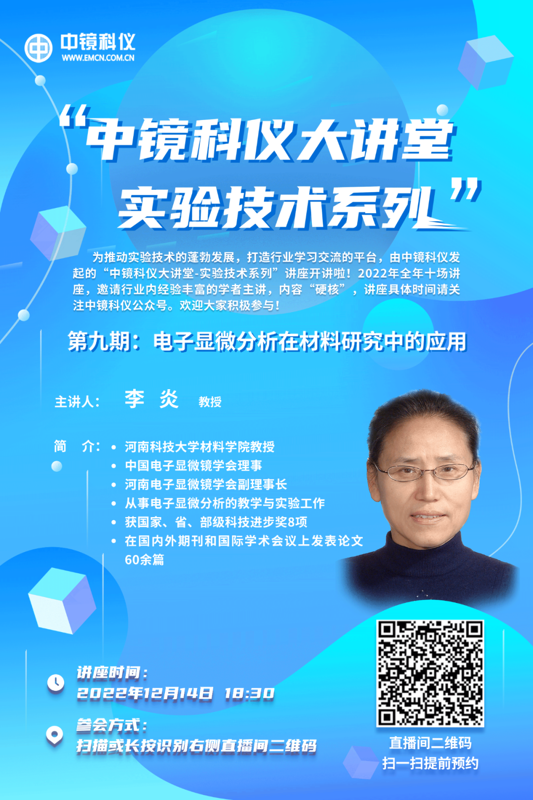 第九期:《電子顯微鏡分析在材料研究中的應用》-李炎 現(xiàn)將本期講座回放發(fā)布,供大家學習,歡迎大家觀看!本系列共十場講座,每月一期,具體時間請持續(xù)關注中鏡科儀公眾號,歡迎大家積極參與!