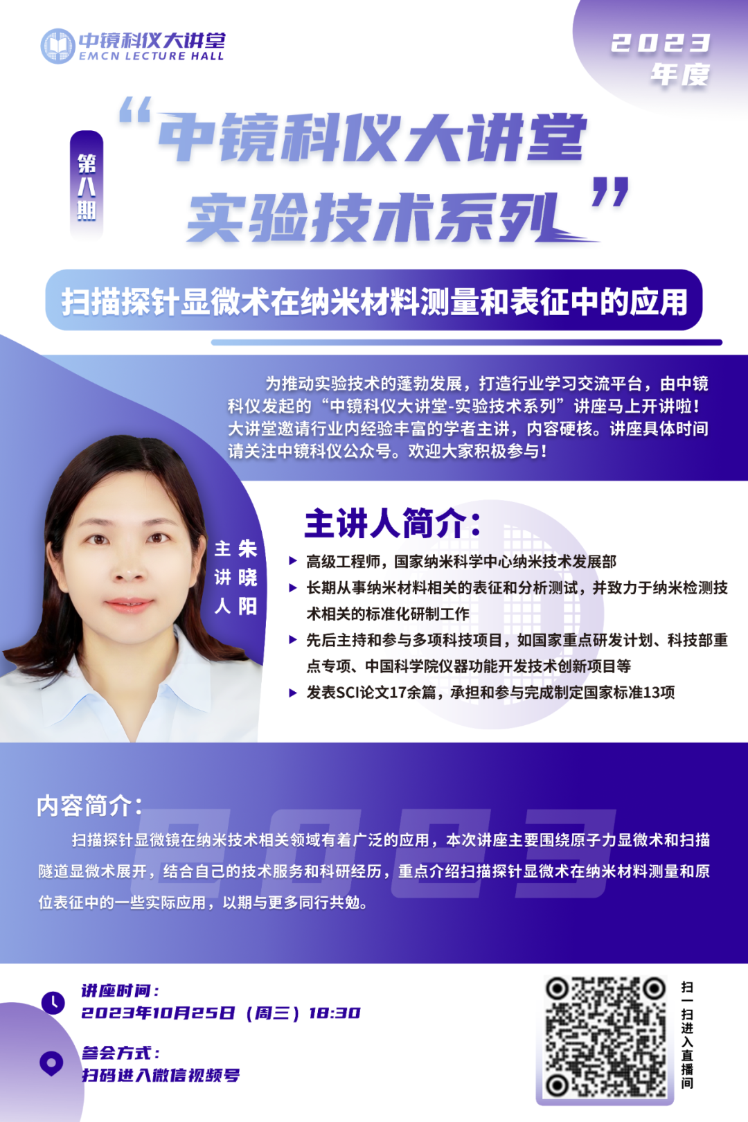 中鏡科儀大講堂-實(shí)驗(yàn)技術(shù)系列視頻回放 第八期:掃描探針顯微術(shù)在納米材料測(cè)量和表征中的應(yīng)用 為推動(dòng)實(shí)驗(yàn)技術(shù)的蓬勃發(fā)展,打造行業(yè)學(xué)習(xí)交流的平臺(tái),由中鏡科儀發(fā)起的2023年“中鏡科儀大講堂”第八期-“實(shí)驗(yàn)技術(shù)系列”講座圓滿結(jié)束! 在納米科技發(fā)展過(guò)程中,以掃描探針顯微術(shù)為核心的納米表征與測(cè)量技術(shù)起到了關(guān)鍵性作用。本期特邀國(guó)家納米科學(xué)中心朱曉陽(yáng)為我們帶來(lái)了《掃描探針顯微術(shù)在納米材料測(cè)量和表征中的應(yīng)用》的專題講座。講座圍繞掃描探針顯微術(shù)技術(shù)特點(diǎn)及支撐的科研成果、原位光電測(cè)量技術(shù)的應(yīng)用進(jìn)行深入的探討。內(nèi)容詳實(shí),深入淺出,精彩非凡! 現(xiàn)將本期講座回放發(fā)布,供大家學(xué)習(xí),歡迎大家觀看!