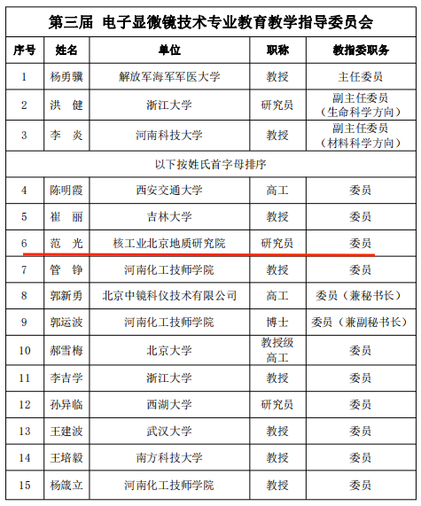 3月2日,由谷湘平博士和楊和雄博士及李婷博士聯(lián)合申報(bào),以核工業(yè)北京地質(zhì)研究院、第三屆電子顯微鏡技術(shù)專業(yè)教育教學(xué)指導(dǎo)委員會(huì)委員(簡稱教指委)范光研究員命名的新礦物——范光鉬礦(Fanguangite),獲國際礦物學(xué)會(huì)新礦物命名及分類委員會(huì)全票通過,批準(zhǔn)編號(hào):IMA-2023-112。 范光鉬礦的化學(xué)式為(MoO2)(PO3OH)·4H2O,三斜晶系,空間群Pˉ1, 產(chǎn)于美國猶他州中部馬里斯維爾鈾-鉬礦區(qū)的自由2號(hào)礦。范光鉬礦以核工業(yè)北京地質(zhì)研究院礦物學(xué)家范光研究員命名(圖1)。 圖1 2023年范光研究員接受央視記者采訪 范光鉬礦是具有全新化學(xué)成分和晶體結(jié)構(gòu)的磷鉬酸鹽新礦物,晶體中MoO5H2O八面體和PO3OH四面體互聯(lián)形成雙鏈構(gòu)造,鏈間分布通道水,鏈間通道水和晶體結(jié)構(gòu)對環(huán)境溫度和濕度極為敏感,揭示了新的礦物晶體化學(xué)現(xiàn)象,預(yù)示其在醫(yī)藥、化工、環(huán)保領(lǐng)域中具有重要的應(yīng)用潛力。范光鉬礦屬于鈾-鉬礦床淺部的次生礦物,其中的鉬與磷是重要的工農(nóng)業(yè)原料,有著廣泛的應(yīng)用范圍。 圖2 范光鉬礦的標(biāo)本(藍(lán)鉬礦基質(zhì)中灰白色片狀范光鉬礦晶體)及范光鉬礦單晶體顯微鏡圖像 圖3 范光鉬礦晶體結(jié)構(gòu)中的鏈狀構(gòu)造及鏈間的通道水 范光研究員1985年畢業(yè)于成都地質(zhì)學(xué)院,隨后進(jìn)入核工業(yè)北京地質(zhì)研究院工作,是我國杰出的電子探針和鈾礦物專家,對欒氏鋰云母、氧鈉細(xì)晶石、冕寧鈾礦、嫦娥石、鈮包頭礦等十多種新礦物的發(fā)現(xiàn)和研究做出了重要貢獻(xiàn)。作為河南化工技師學(xué)院與中鏡科儀集團(tuán)聯(lián)合創(chuàng)辦的電鏡技術(shù)專業(yè)的第三屆教指委委員,范光研究員積極推動(dòng)電鏡專業(yè)的學(xué)科建設(shè)與教學(xué)改革,進(jìn)一步提高人才培養(yǎng)質(zhì)量,為專業(yè)建設(shè)和發(fā)展作出了貢獻(xiàn)。 第三屆電子顯微鏡技術(shù)專業(yè)教育教學(xué)指導(dǎo)委員會(huì)名單