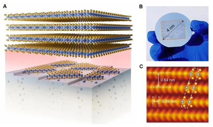 晶體是計(jì)算機(jī)、通訊、航空、激光技術(shù)等領(lǐng)域的關(guān)鍵材料。傳統(tǒng)制備大尺寸晶體的方法,通常是在晶體小顆粒表面“自下而上”層層堆砌原子,好像“蓋房子”,從地基逐層“砌磚”,最終搭建成“屋”。 北京大學(xué)科研團(tuán)隊(duì)在國(guó)際上首創(chuàng)出一種全新的晶體制備方法,讓材料如“頂著上方結(jié)構(gòu)往上走”的“頂竹筍”一般生長(zhǎng),可保證每層晶體結(jié)構(gòu)的快速生長(zhǎng)和均一排布,極大提高了晶體結(jié)構(gòu)的可控性。這種“長(zhǎng)材料”的新方法有望提升芯片的集成度和算力,為新一代電子和光子集成電路提供新的材料。這一突破性成果于7月5日在線發(fā)表于《科學(xué)》雜志。 用“晶格傳質(zhì)-界面生長(zhǎng)”新方法制備晶圓級(jí)二維晶體 用“晶格傳質(zhì)-界面生長(zhǎng)”新方法制備二維晶體過(guò)程(點(diǎn)擊查看視頻)