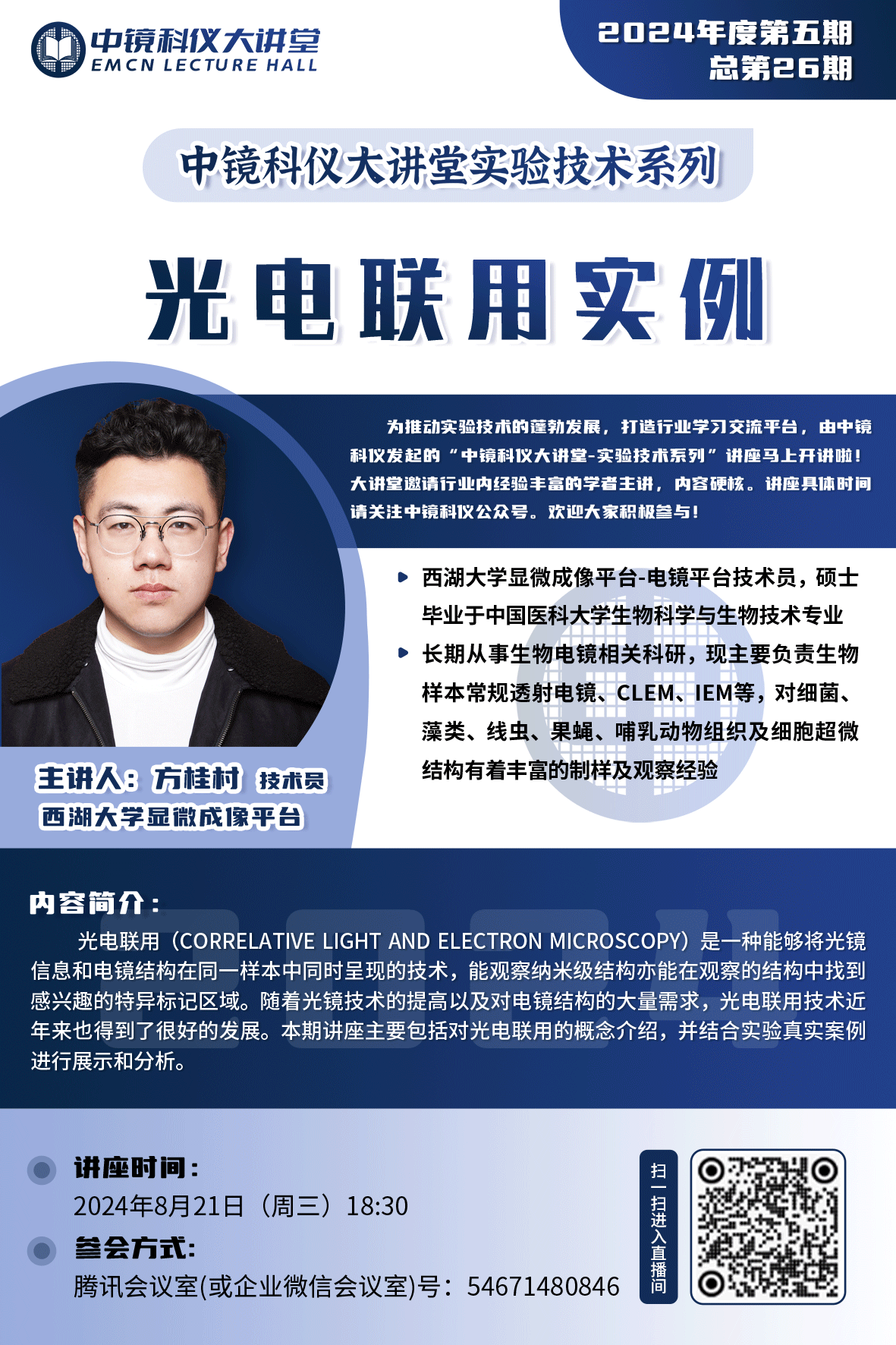 中鏡科儀大講堂-實驗技術(shù)系列視頻回放 第五期:光電聯(lián)用實例 為推動實驗技術(shù)的蓬勃發(fā)展,打造行業(yè)學(xué)習(xí)交流的平臺,由中鏡科儀發(fā)起的2024年“中鏡科儀大講堂”第五期-“實驗技術(shù)系列”講座圓滿結(jié)束! 光學(xué)顯微鏡和電子顯微鏡是觀測微觀世界的常用工具,兩者都有其優(yōu)勢,也有其局限之處,為了兼具兩者的優(yōu)勢光電聯(lián)用技術(shù)應(yīng)用而生。本期特邀西湖大學(xué)顯微成像平臺電鏡平臺技術(shù)員方桂村為我們帶來了《光電聯(lián)用實例》的專題講座。講座結(jié)合實驗案例,詳細(xì)介紹了光電聯(lián)用技術(shù)的發(fā)展和應(yīng)用。內(nèi)容詳實,深入淺出,精彩非凡! 現(xiàn)將本期講座回放發(fā)布,供大家學(xué)習(xí),歡迎大家觀看!